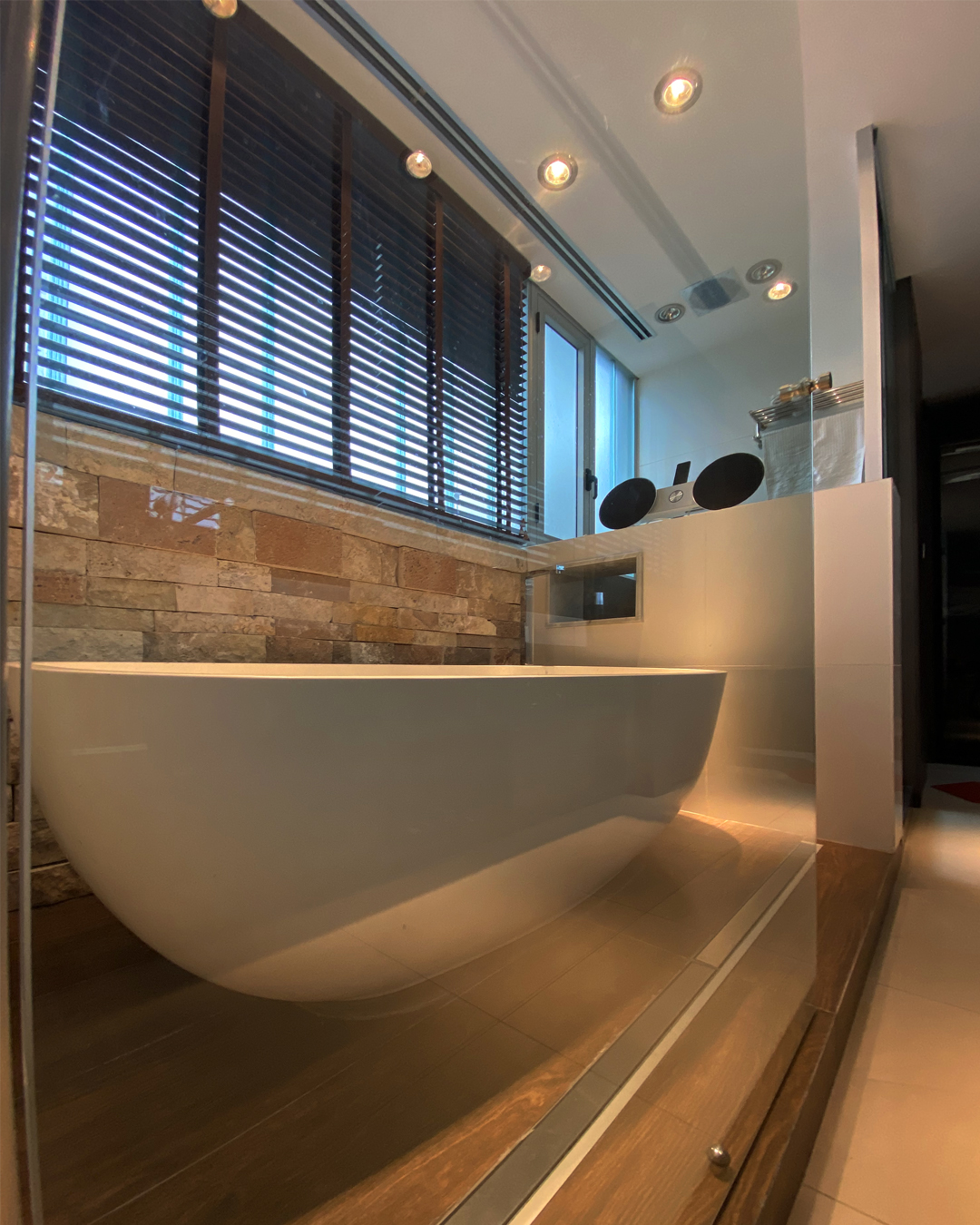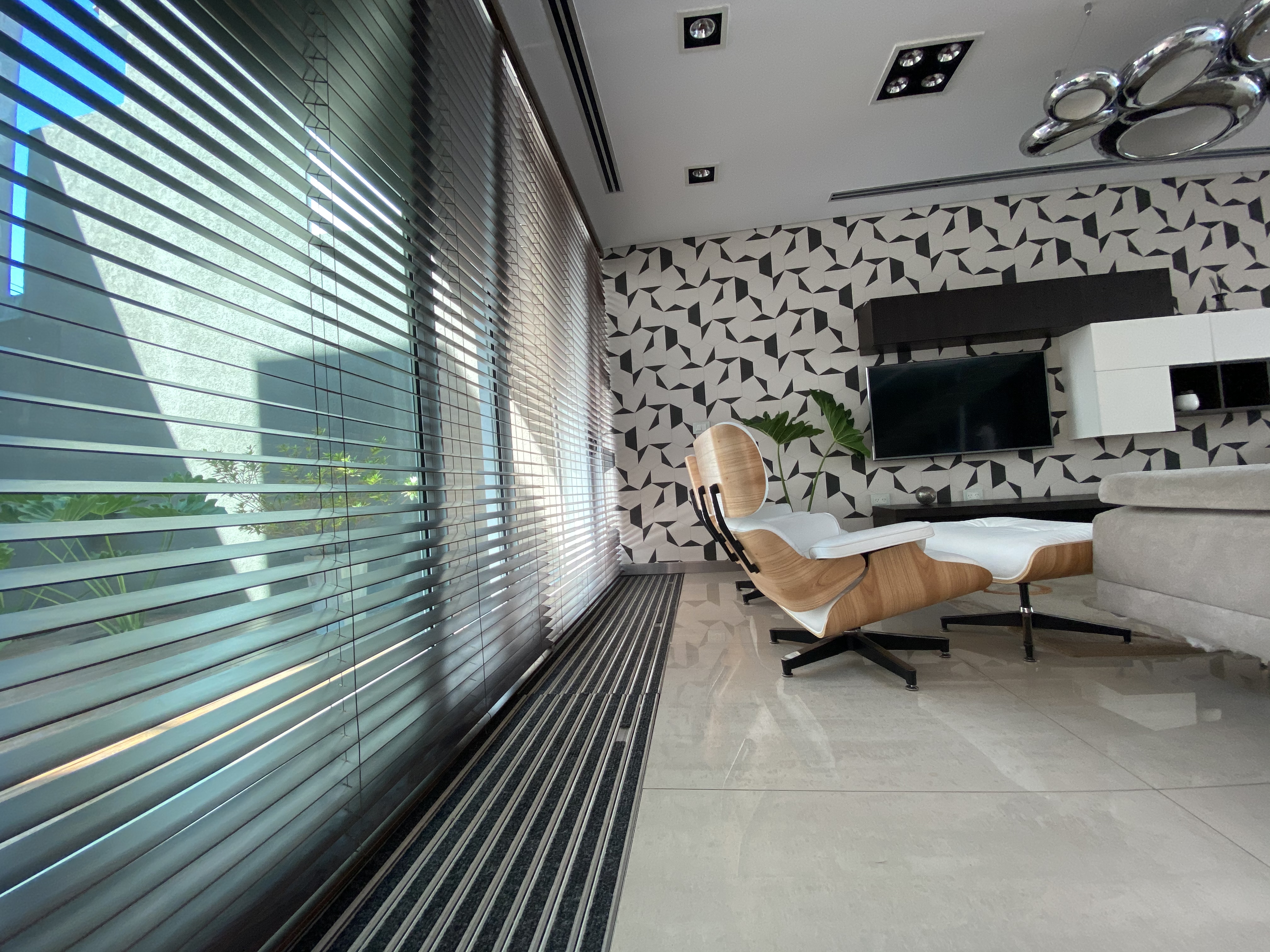 Un volumen lateral donde se alojan todos los servicios (garage deposito cocina sanitarios salas de maquina) de mármol travertino rustico deja como espacio resultante un gran flanco reflejante que alberga al área social de la casa, iluminado naturalmente por una cubierta acristalada.
