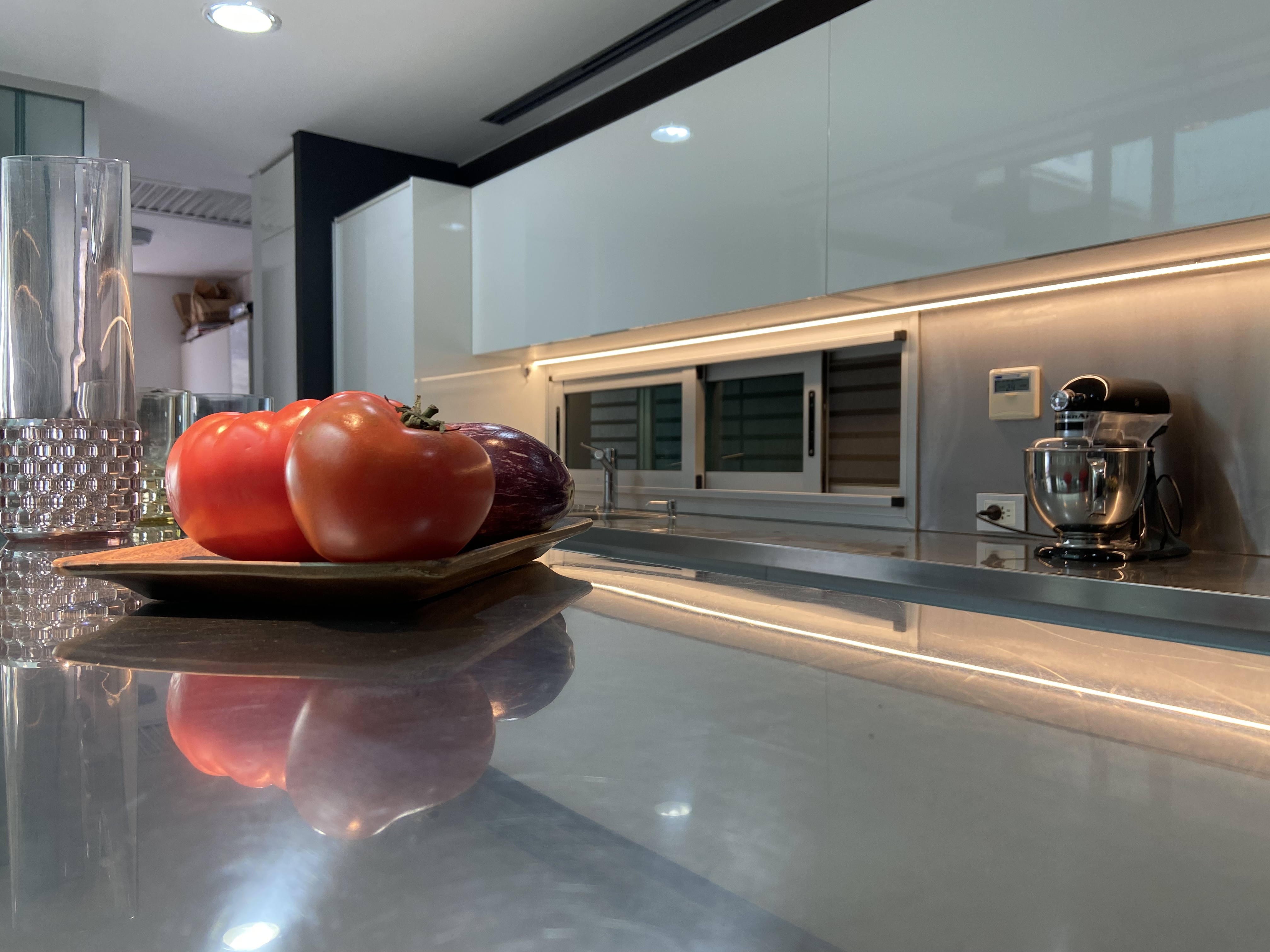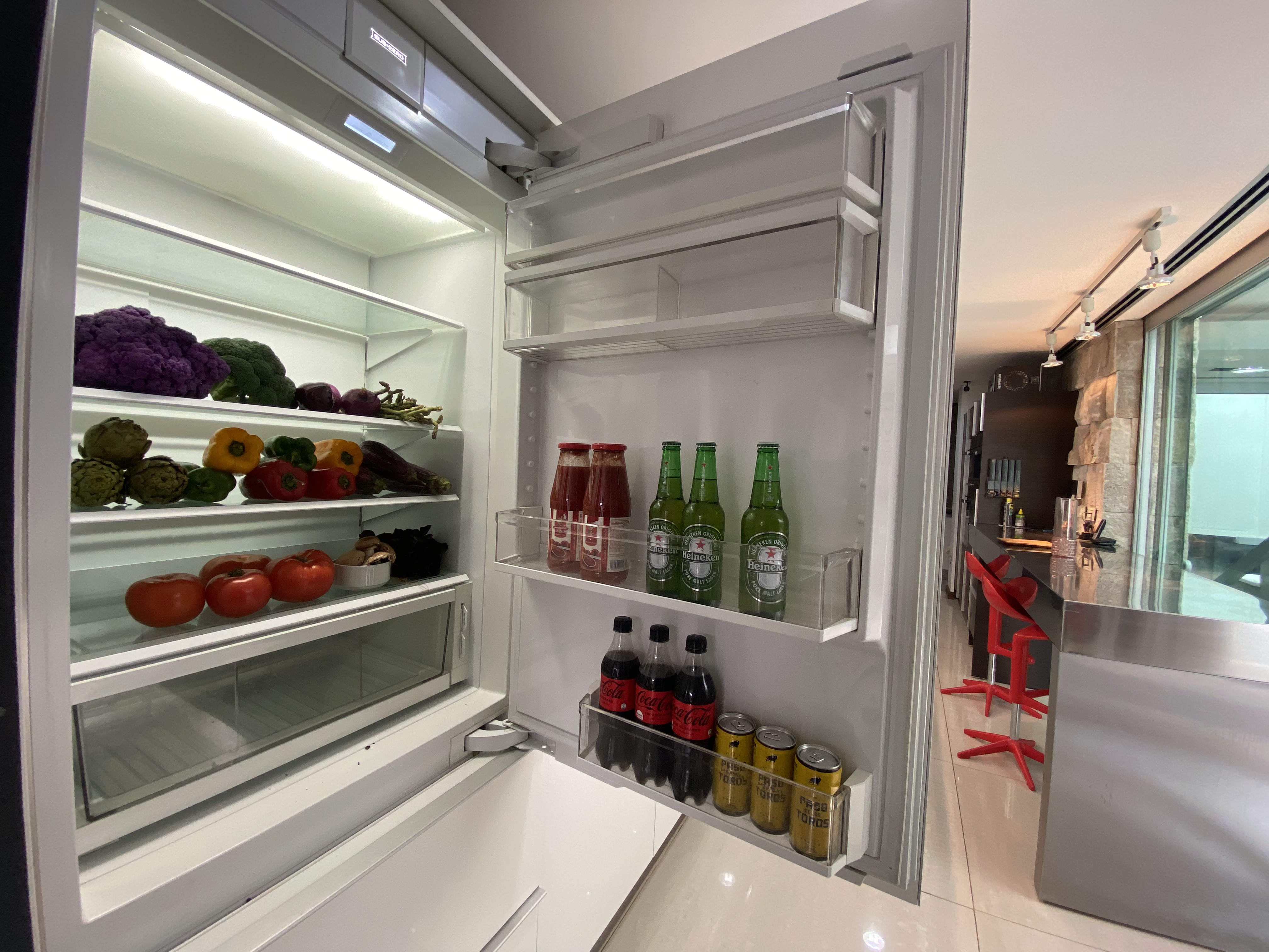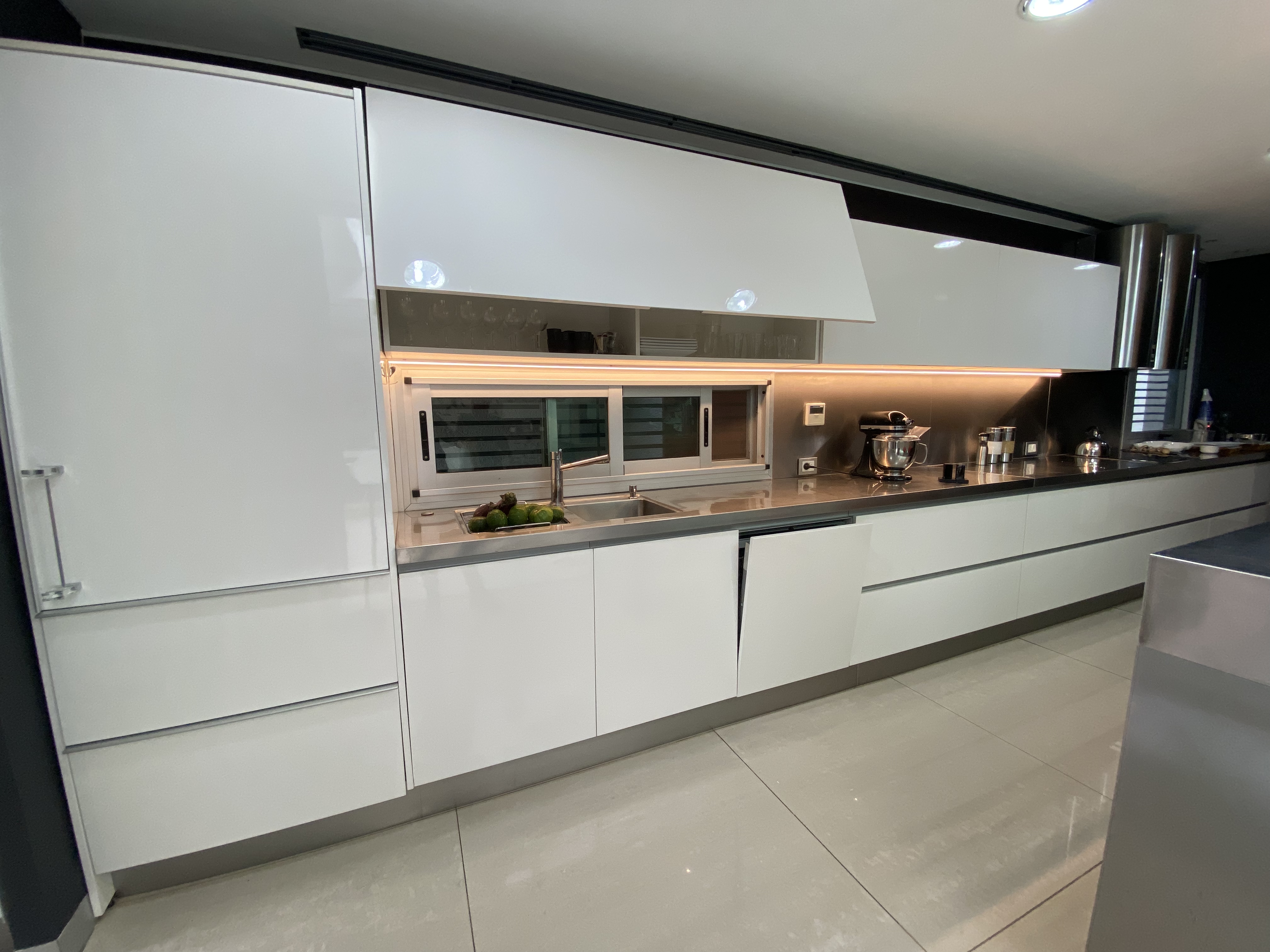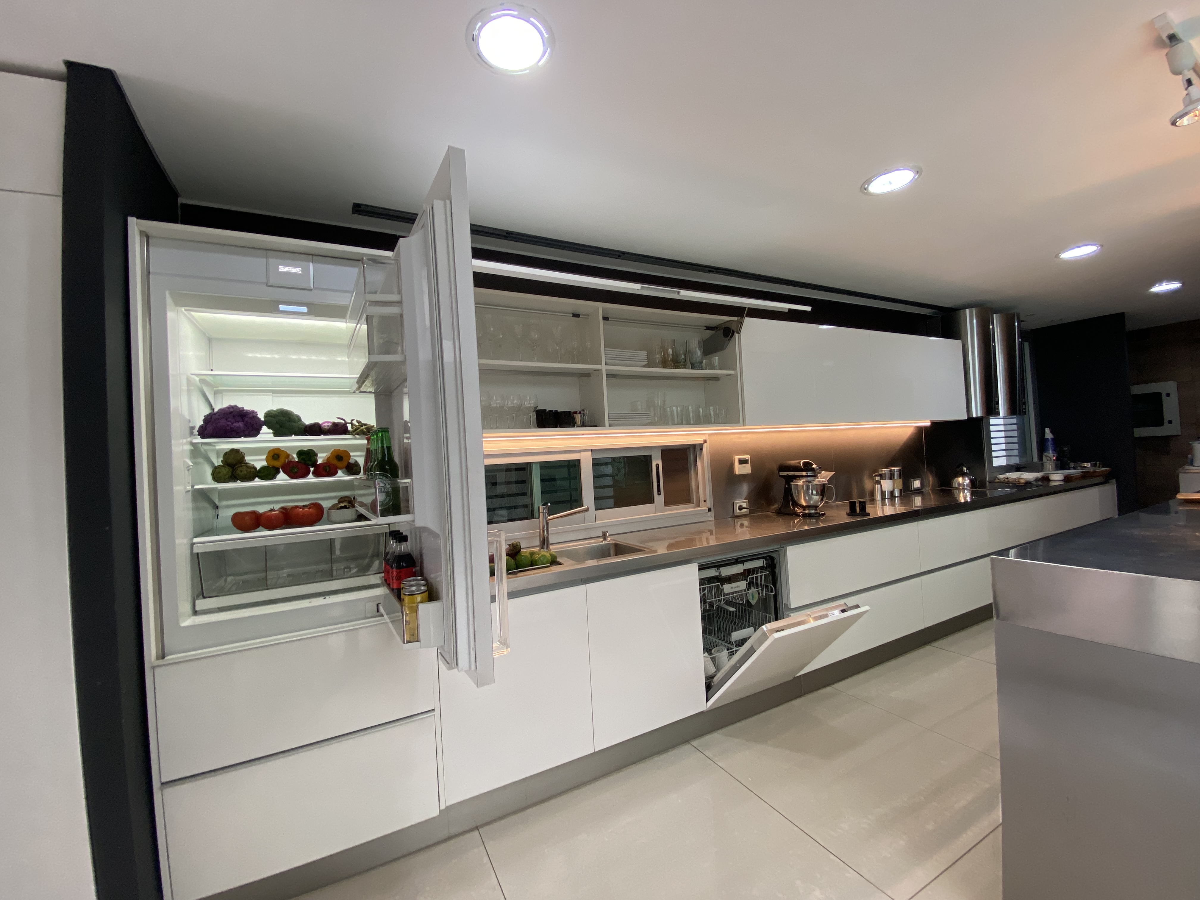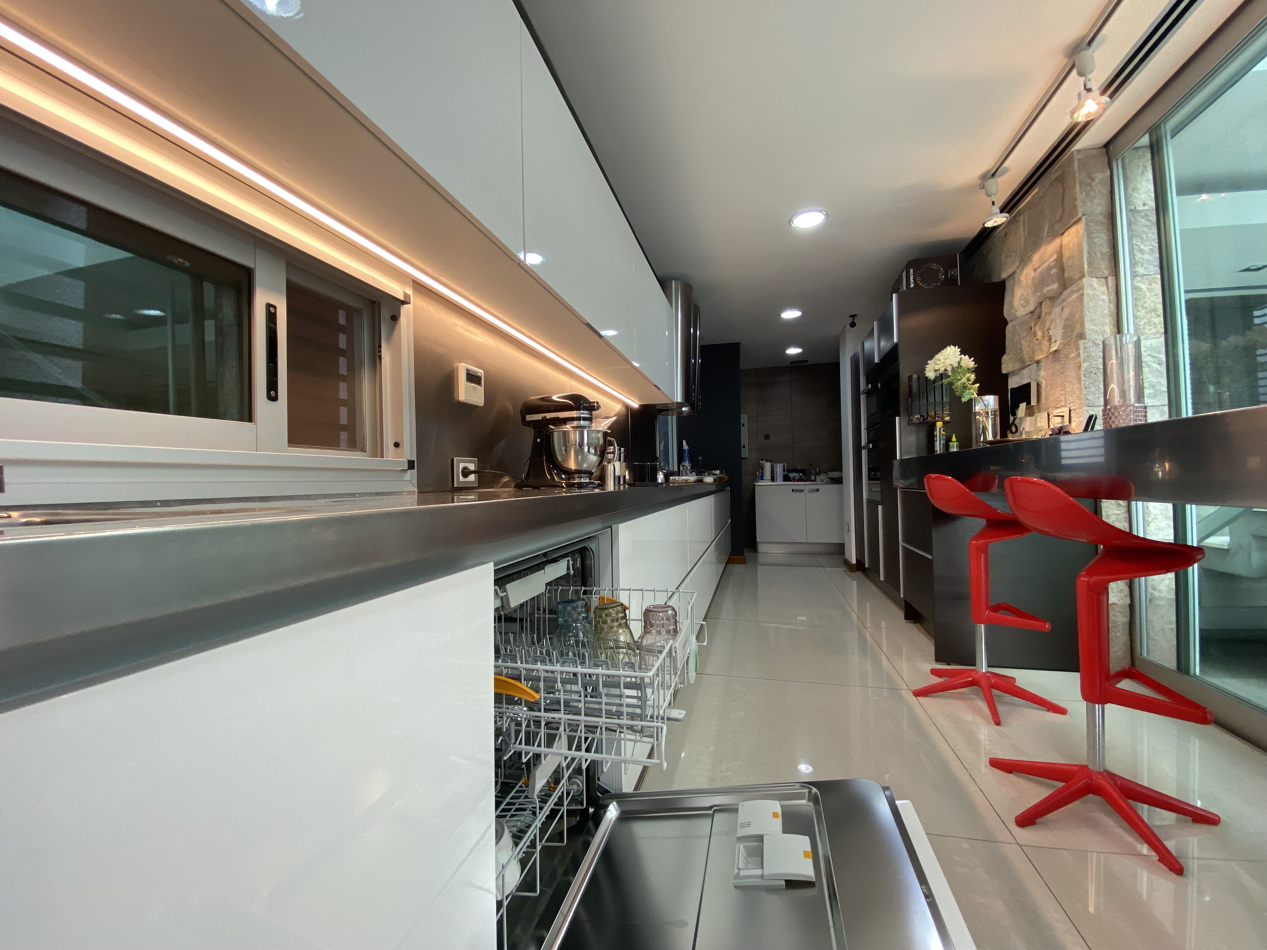La cocina aquí tiene un rol fundamental conviviendo o relacionándose con los demás espacios mediante cerramientos dinámicos de cristal que una vez abiertos dan como resultado un espacio único pero que al cerrarlos aíslan las actividades propias de estos espacios de servicio.