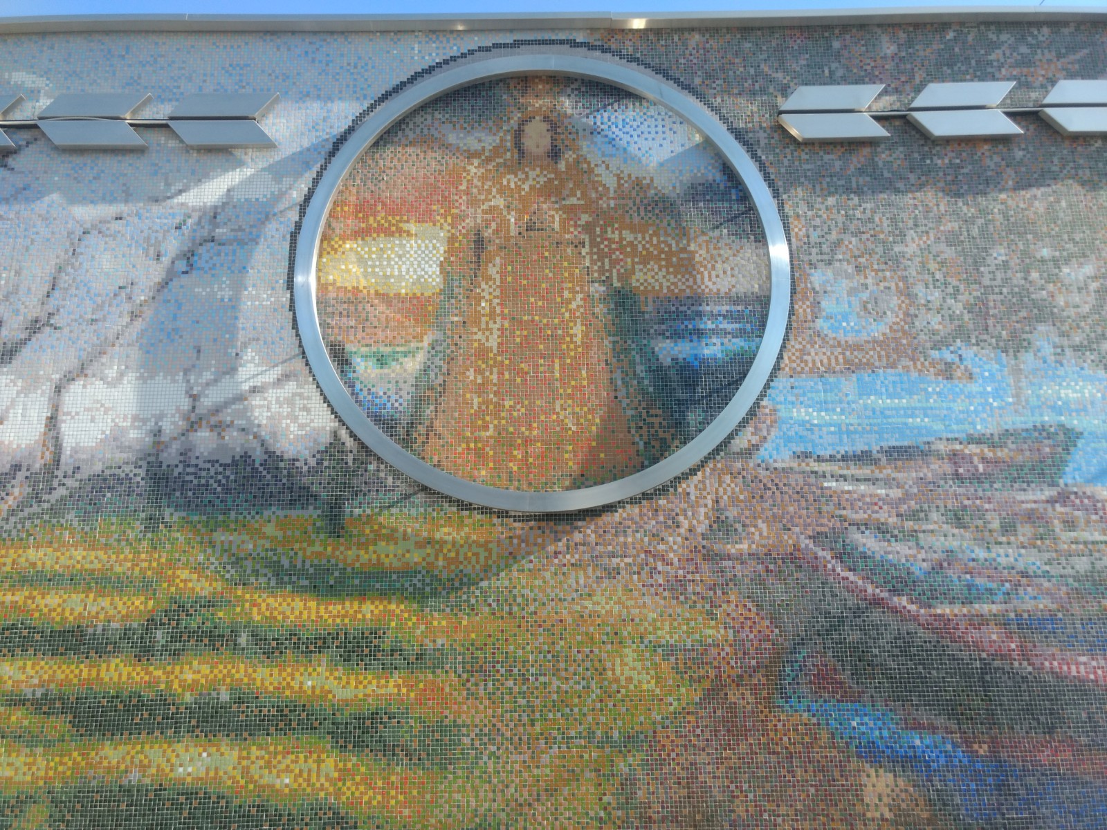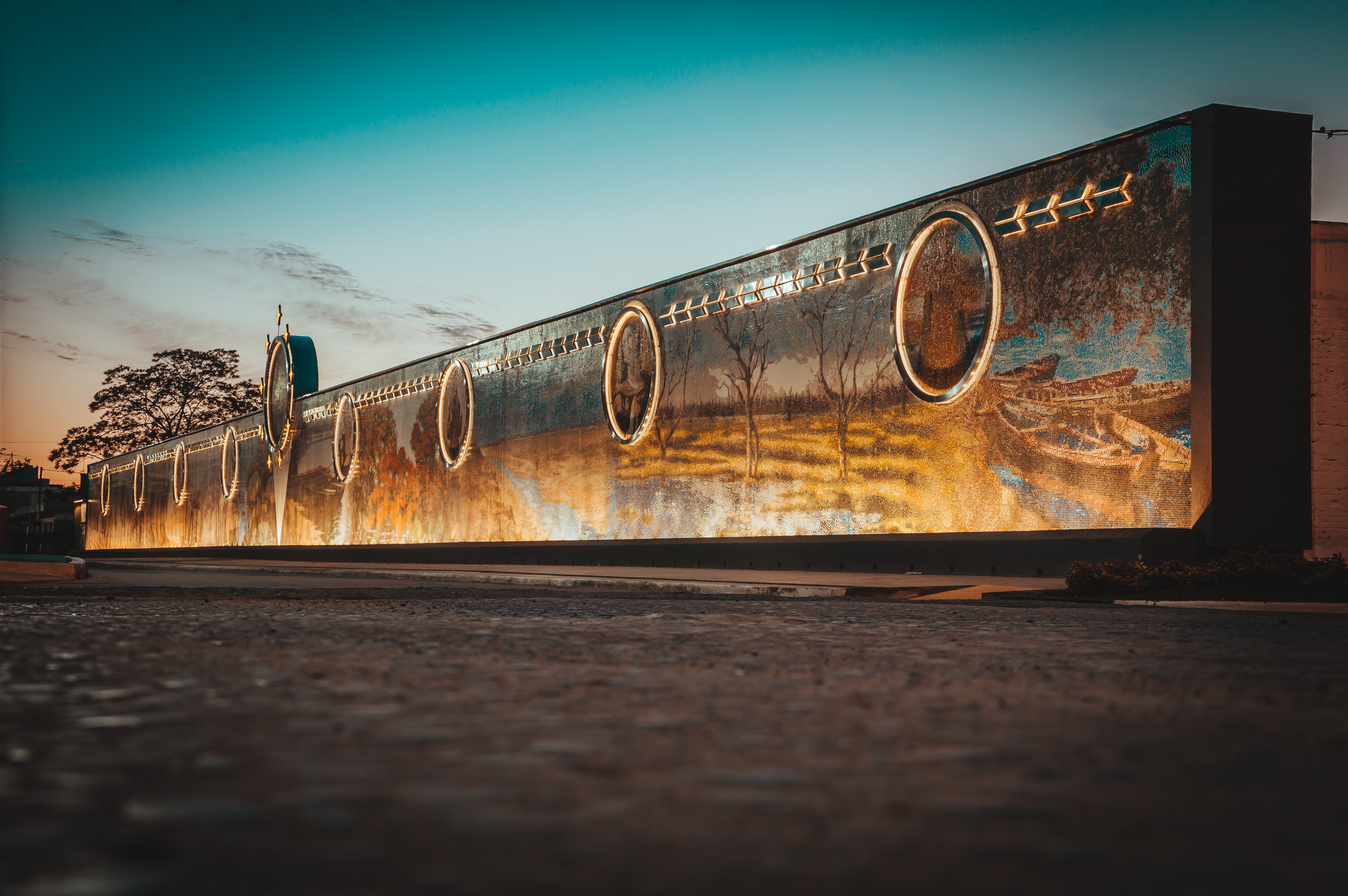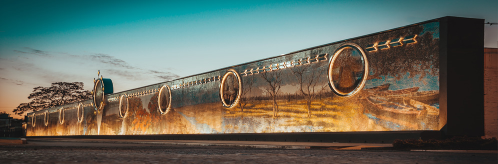 La prestigiosa artista plástica local Graciela Marechal contacto con el estudio y juntos logran el engarce de sus obras sobre la composicion del fondo de la bandera provincial, enfatizando de manera tridimensional con acero inoxidable, a los santos patronos de cada departamento, unidos entre ellos por volumenes corpóreos de los laureles de nuestra bandera. Las obras abarcan paisajes bellisimos de nuestra provincia captados pro Graciela y expresados con su creatividad en oleos que fueron minuciosamente pixelados traducidos a una trama de pixeles de vidrio opaco y translucido en mas de 50 colores y tonalidades.