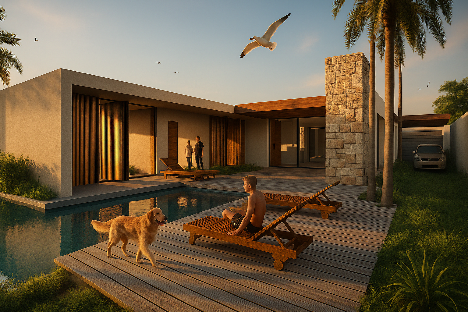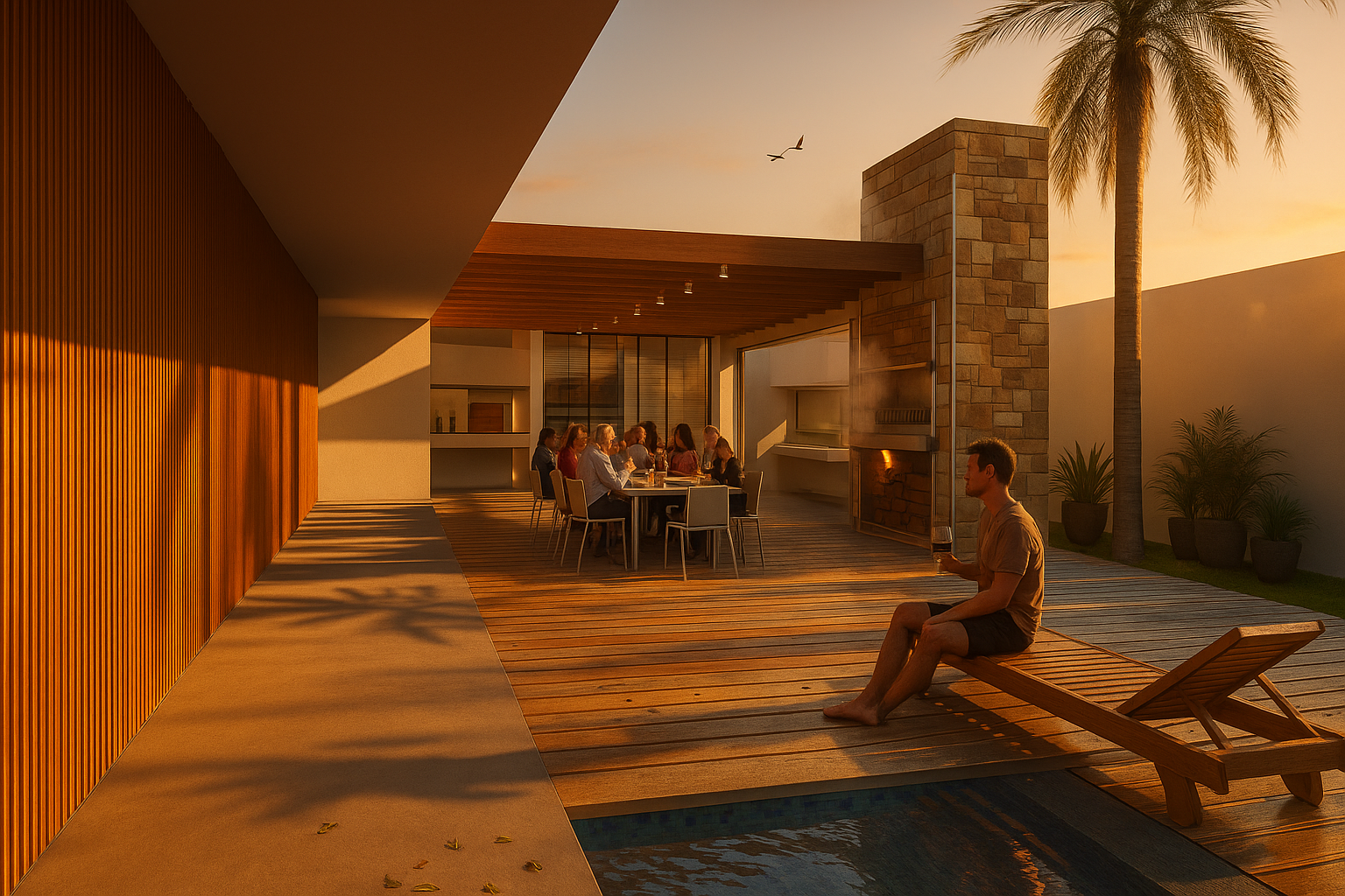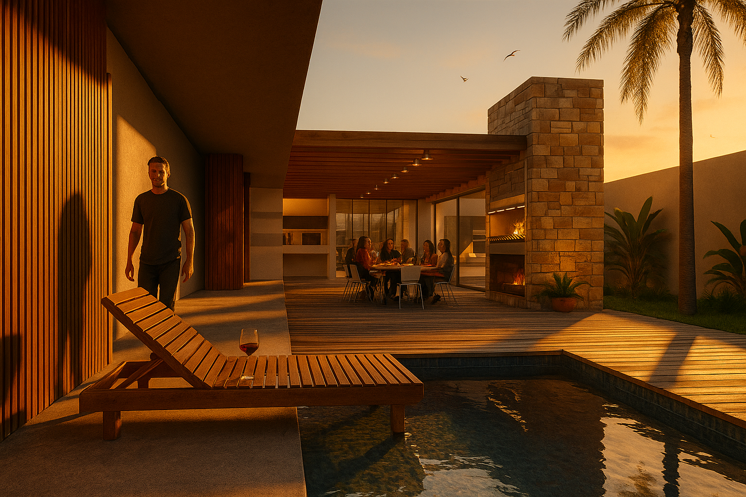 La casa es el lugar de estar de una familia y si la familia es numerosa, sumada a la vida social activa, la misma requerirá un espacio que resuelva este pedido. Esta vivienda en la provincia de santa fe se emplaza en una locación semi rural que propicia este tipo de planteo. La piedra, la madera y el hormigón se conjugan para dar vida a esta casa que parece posarse en el agua de la piscina que acoge al visitante