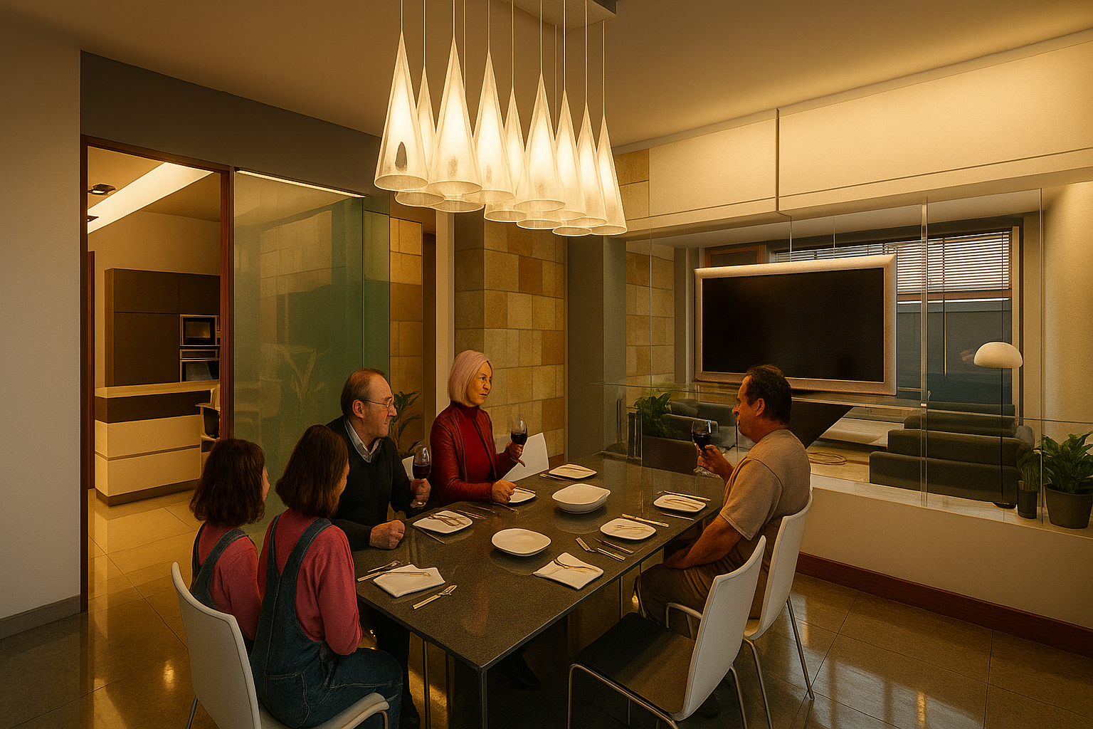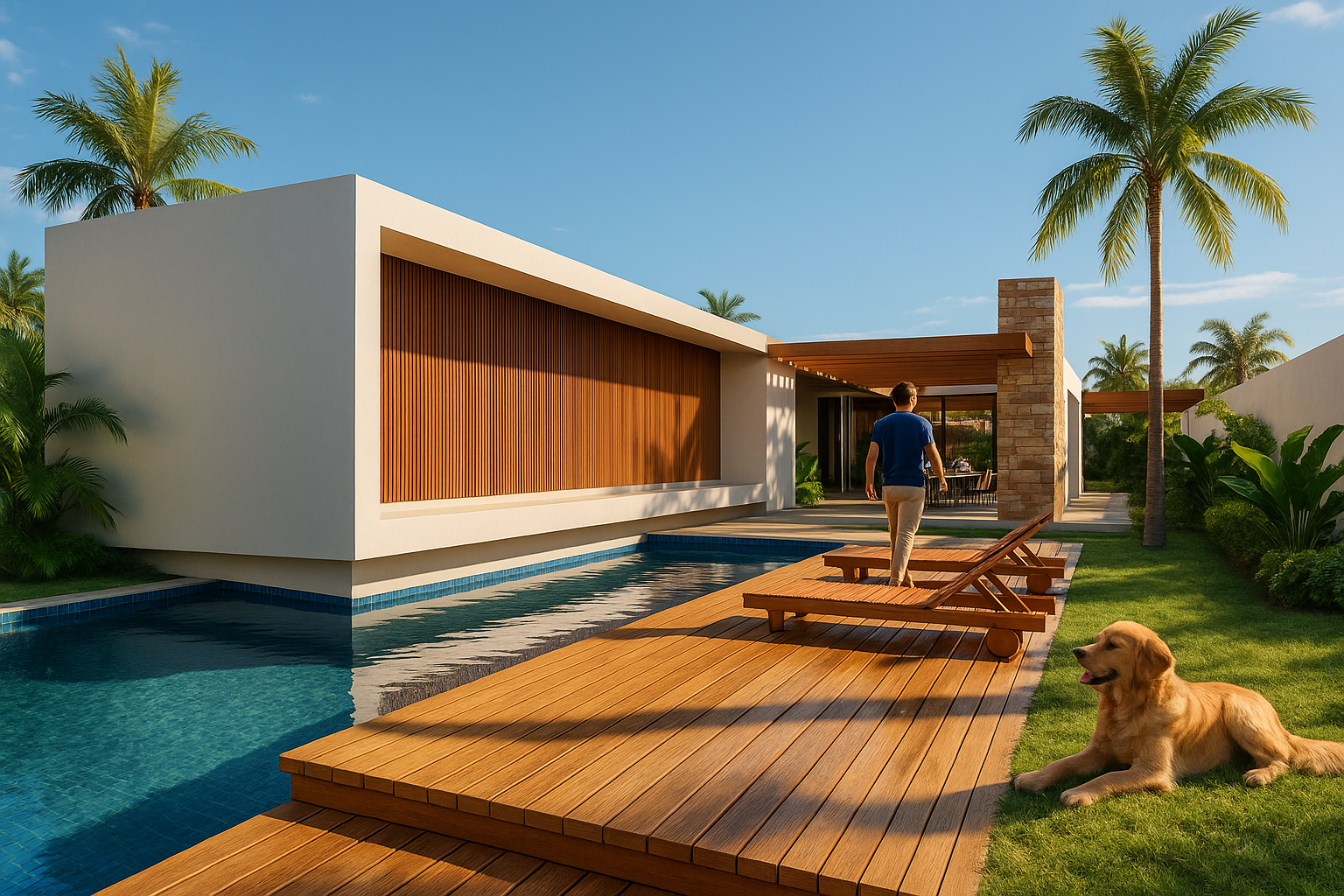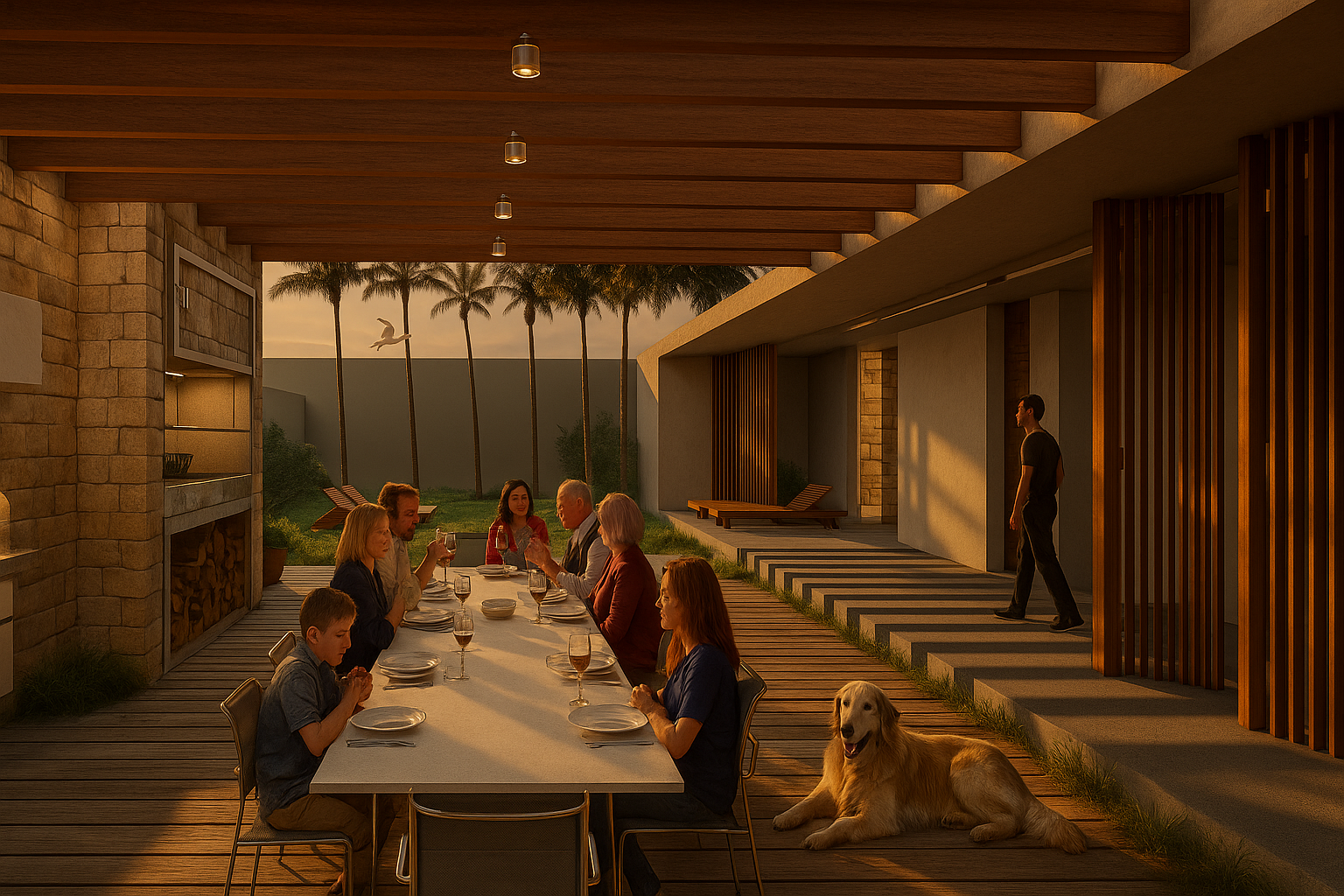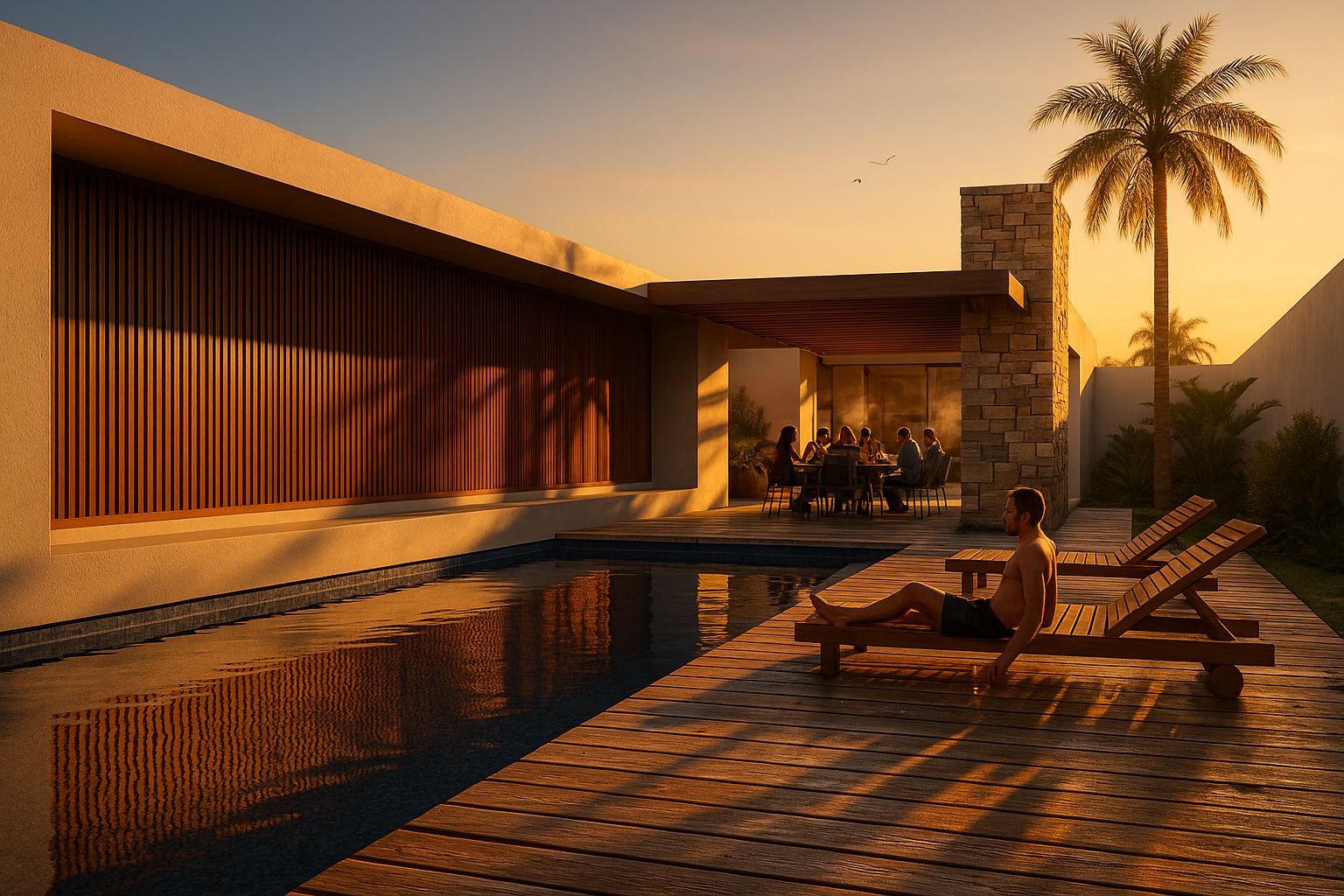 La casa es el lugar de estar de una familia y si la familia es numerosa, sumada a la vida social activa, la misma requerirá un espacio que resuelva este pedido. Esta vivienda en la provincia de santa fe se emplaza en una locación semi rural que propicia este tipo de planteo. La piedra, la madera y el hormigón se conjugan para dar vida a esta casa que parece posarse en el agua de la piscina que acoge al visitante
