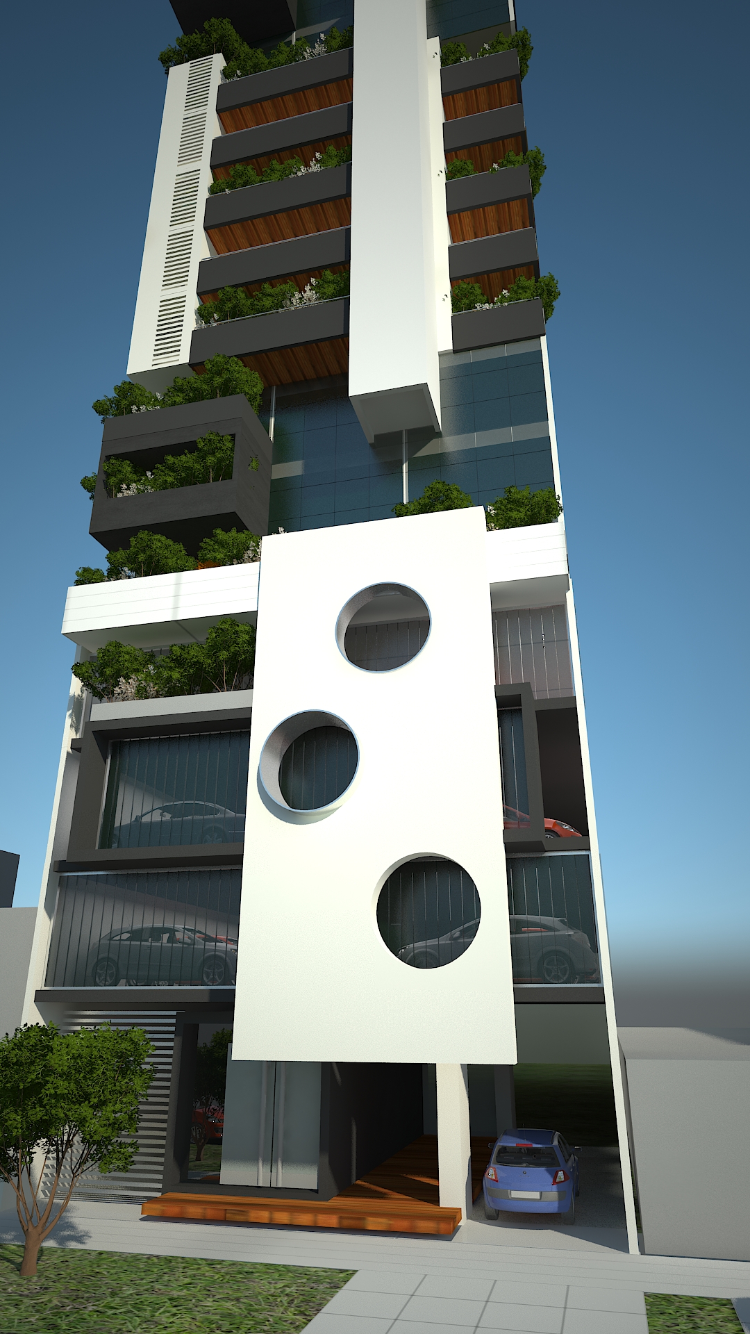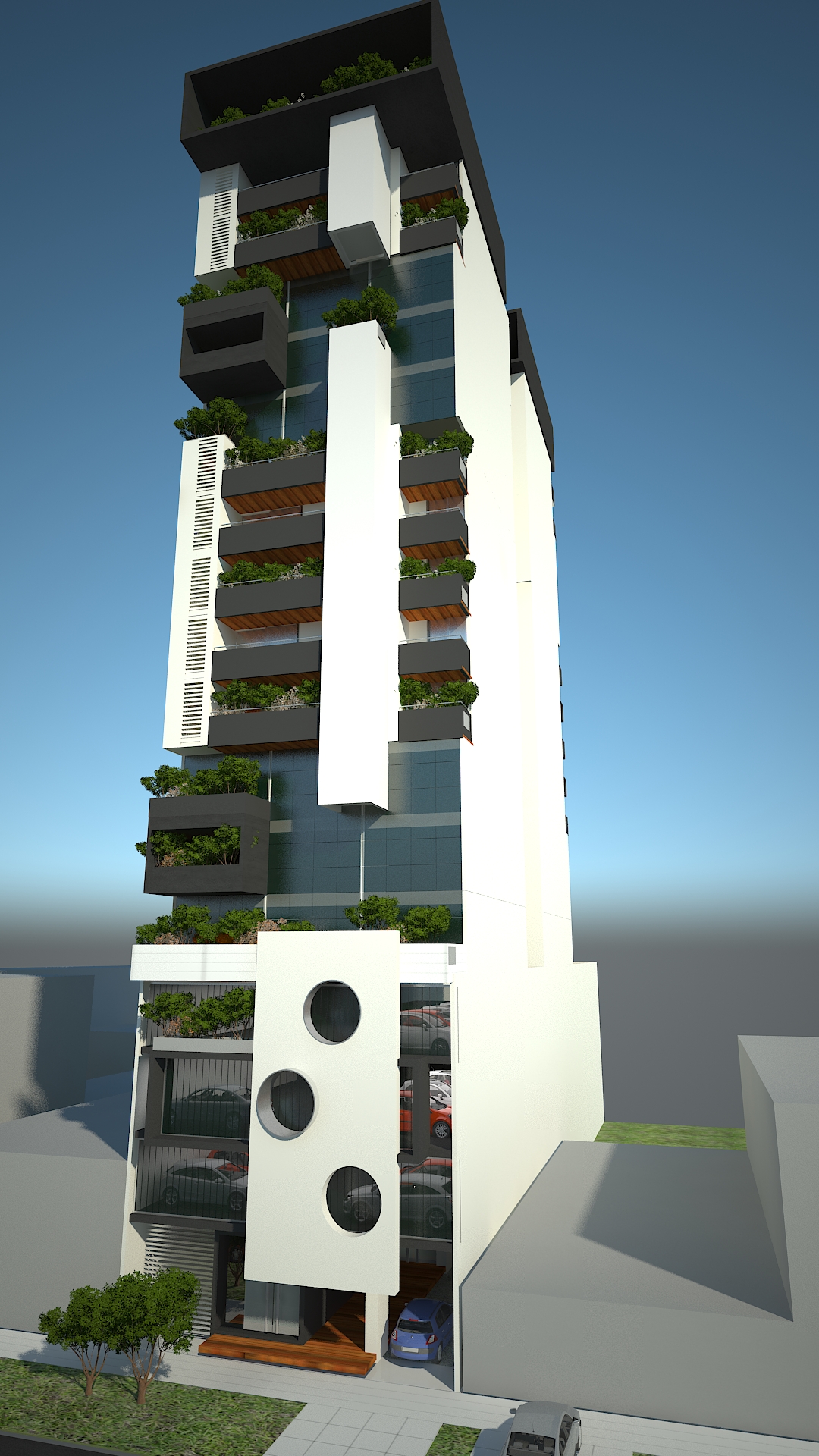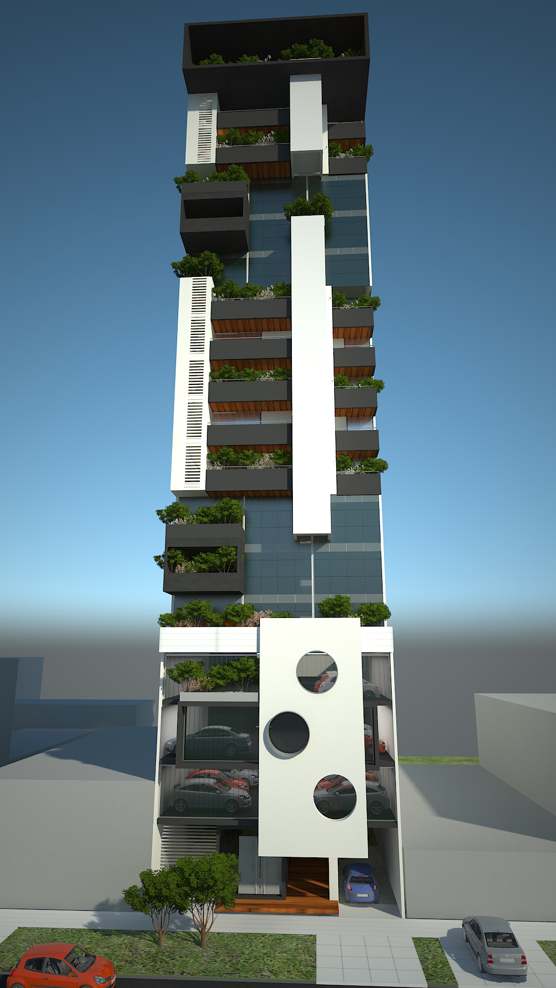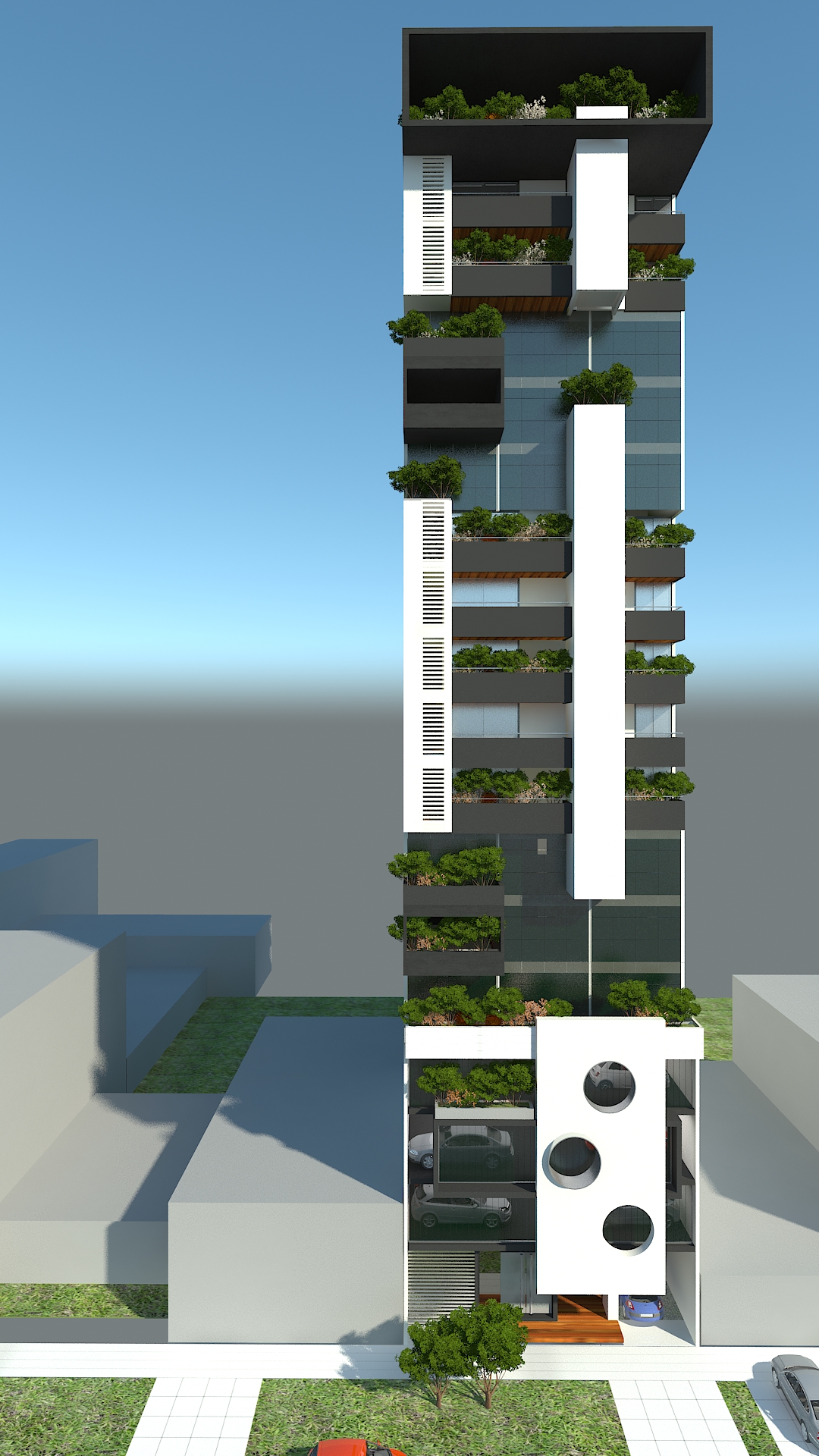 Vivir en altura en Formosa, plantea una experiencia nueva. para empatizar con esta nueva sensación son necesarias las opciones diversas que permitan la apropiación del usuario como incorporando el verde a esta mirada desde lo alto, nueva para muchos, en la ciudad, lo que no debe dejarnos sin la naturaleza a portada de mano, un verde que filtrara estas visuales nuevas y acompañara la transición. El co working, tan en boga en este momento, plantea locales comerciales en planta alta, estacionamientos en los niveles siguientes, luego oficinas, y en los últimos niveles residencias en altura, coronando todo con un sum con piscina en la terraza deck.