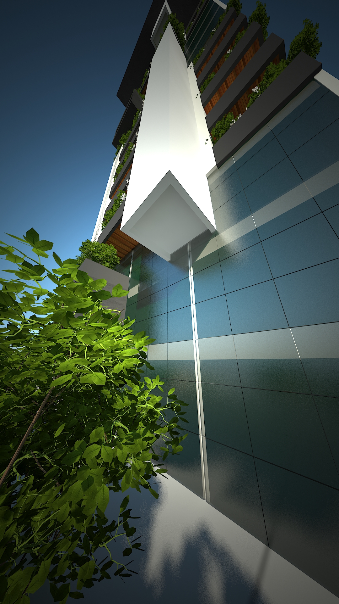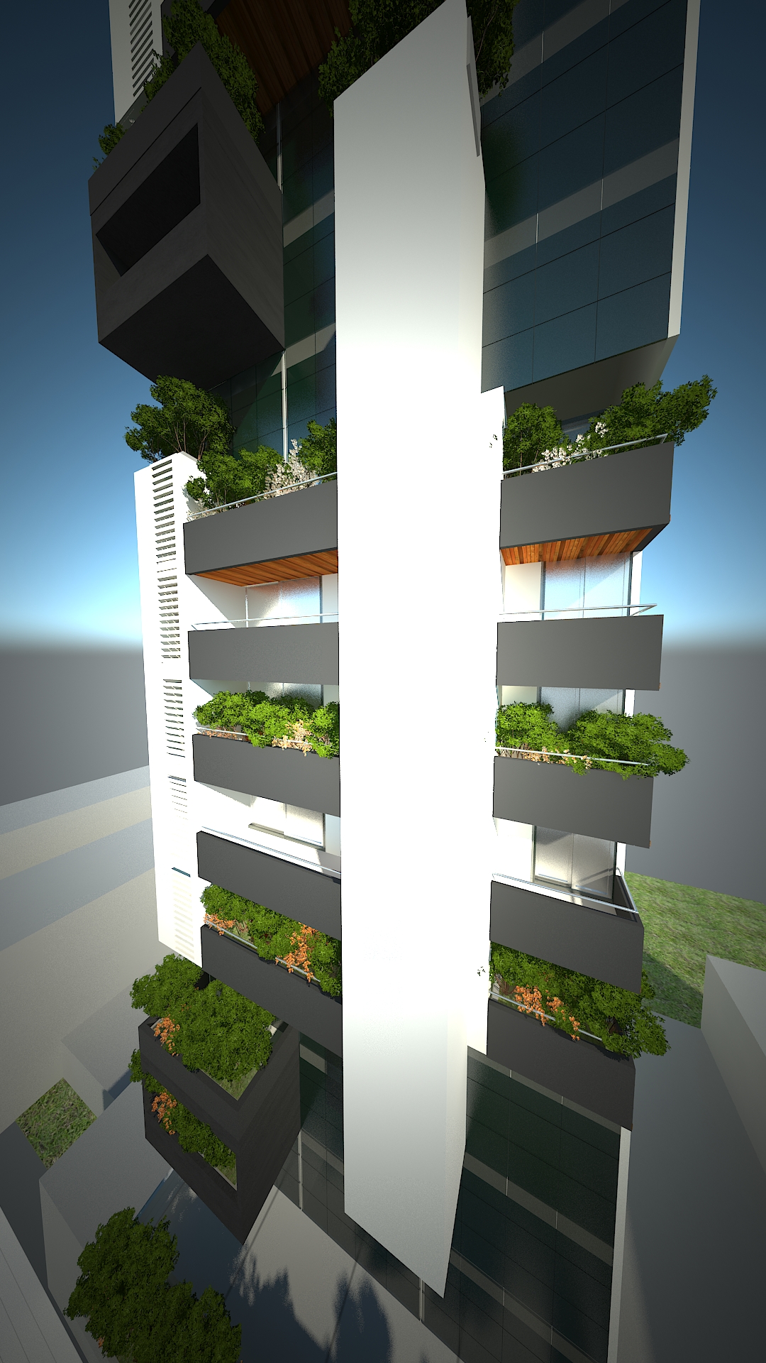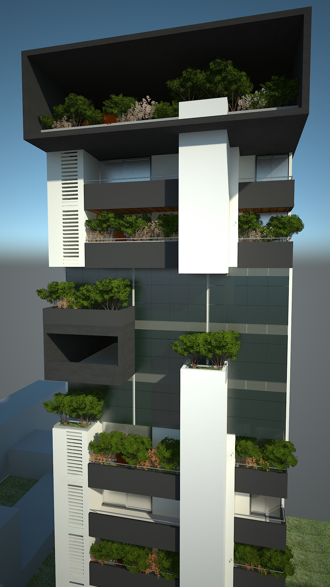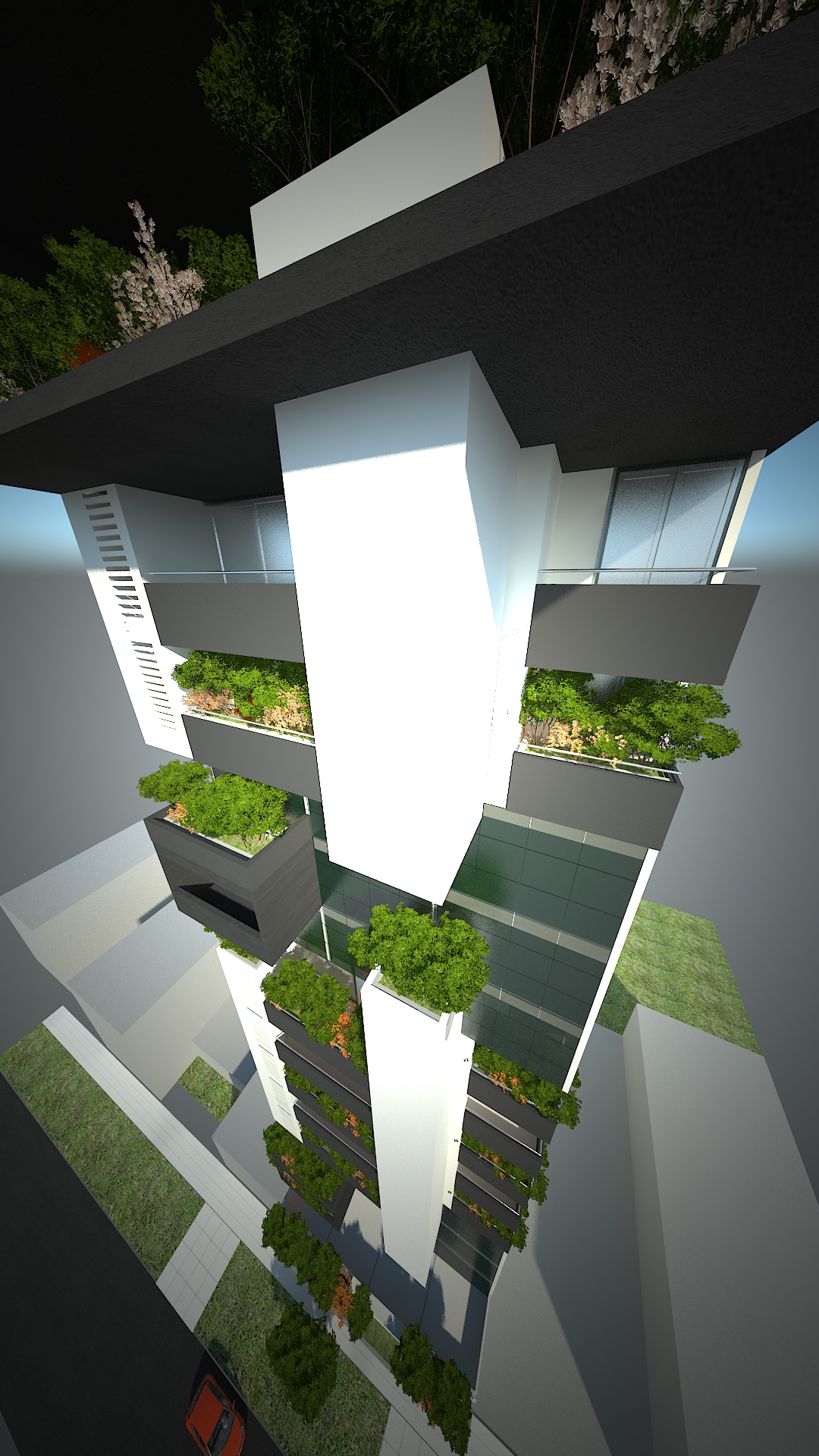 Vivir en altura en Formosa, plantea una experiencia nueva. para empatizar con esta nueva sensación son necesarias las opciones diversas que permitan la apropiación del usuario como incorporando el verde a esta mirada desde lo alto, nueva para muchos, en la ciudad, lo que no debe dejarnos sin la naturaleza a portada de mano, un verde que filtrara estas visuales nuevas y acompañara la transición. El co working, tan en boga en este momento, plantea locales comerciales en planta alta, estacionamientos en los niveles siguientes, luego oficinas, y en los últimos niveles residencias en altura, coronando todo con un sum con piscina en la terraza deck.