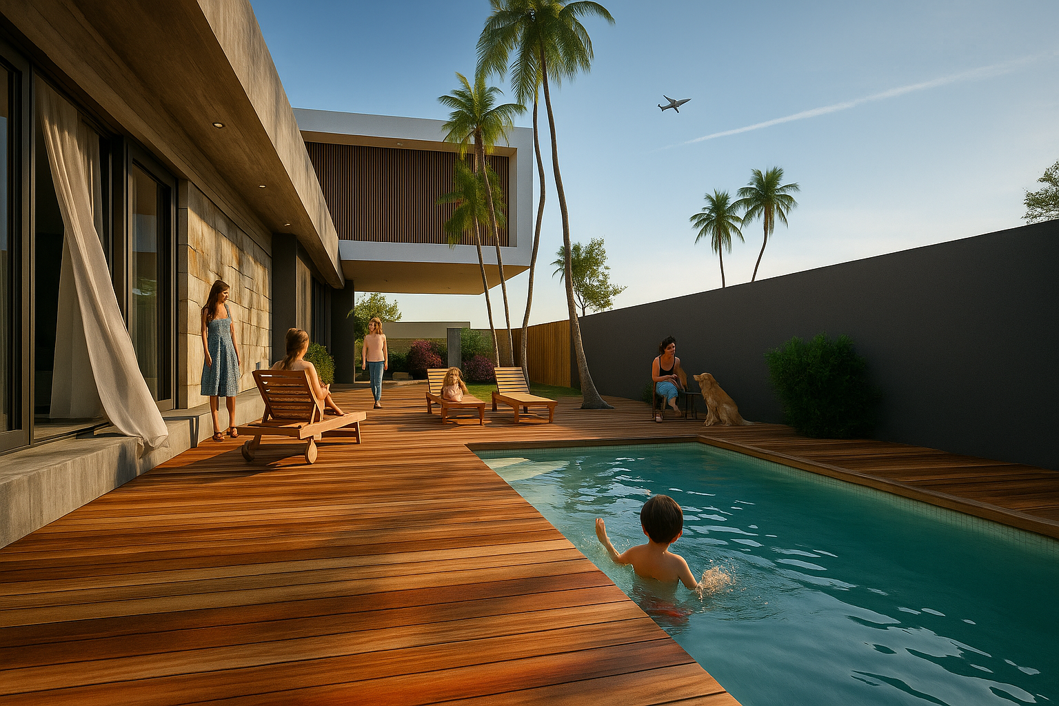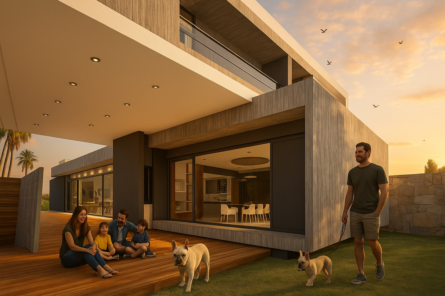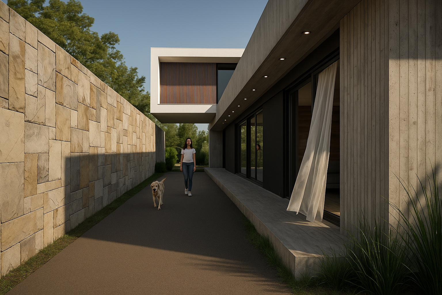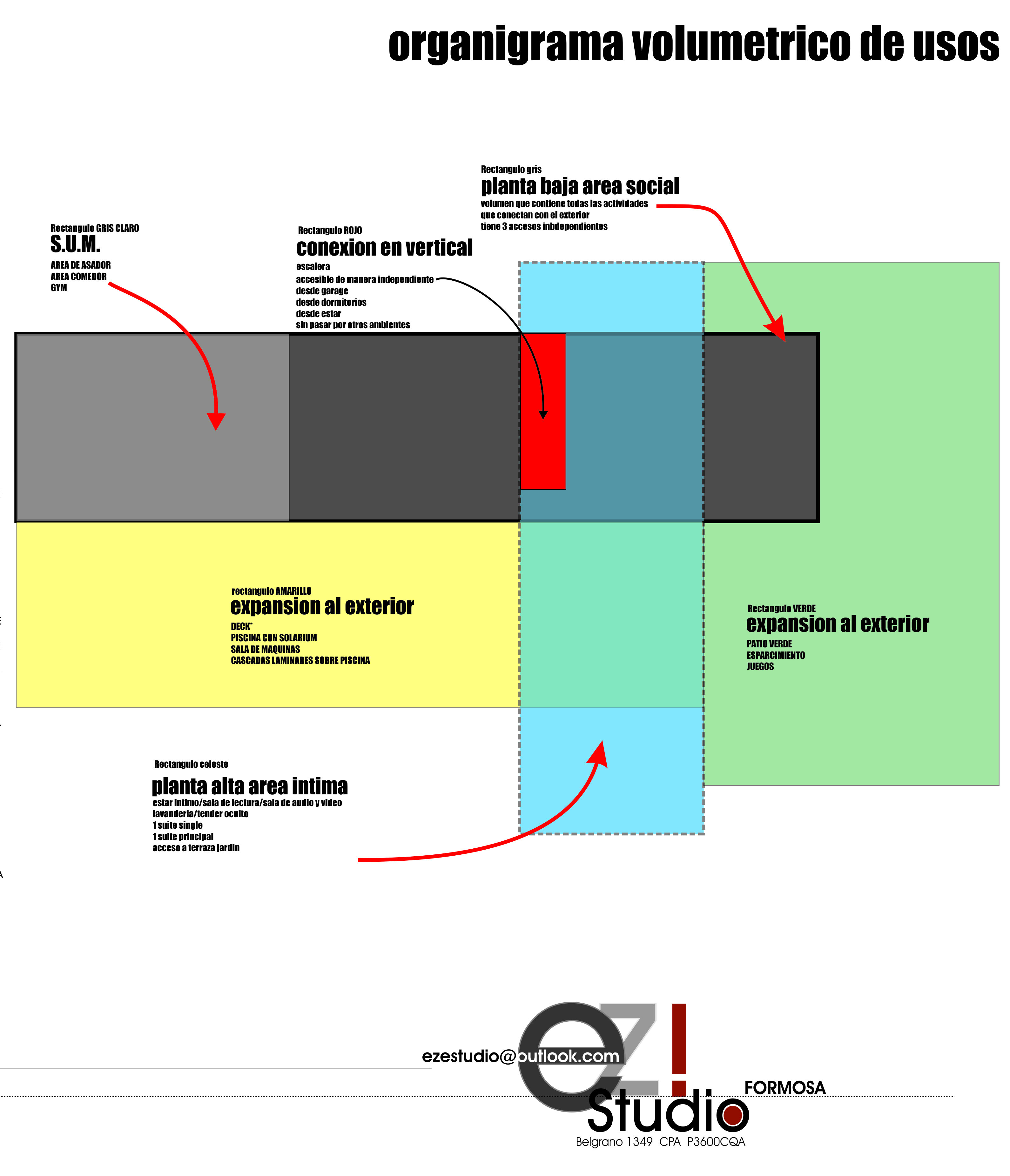 Vivienda que enfatiza la conexión entre los distintos ambientes componentes y de estos con el exterior, pero que a la vez se protege de las agresiones por medio de cerramientos dinámicos que actúan de barrera evitando la necesidad de elementos de cierre tradicionales. Al ingresar nos encontramos con el espacio social compuesto por el estar comedor integrados con apoyo de closet y toilette de cortesía. Estos espacios se perciben como un conjunto dado que los aglomera una gran caja de hormigón que los contiene y la cual sirve de nexo entre los diferentes espacios. Y que por medio de aleros perimetrales cobija los materiales de las inclemencias del tiempo. El sum también posee esta característica de interrelación con el exterior abriéndose sobre el deck para poder disfrutar de lo hecho en la parrilla sentados al aire libre un buen día de sol, o compartir un asado con la gente que se encuentra en la piscina utilizando la misma parrilla o área de fuego. La casa cuenta con un acceso independiente, que bien puede funcionar como ingreso de servicio para el mantenimiento de la piscina o la jardinería sin atravesar la casa, o para sacar al perro y las bicicletas, pero también puede funcionar de ingreso independiente del sum ante un eventual evento para que no disturbe el descanso en la suite o dormitorios, contando con su videoportero individual. Da como resultado una caja de hormigón que flota sobre el terreno dejando que el espacio fluya de un ambiente a otro sin interrupciones pero que a la noche o durante una larga ausencia pueden cerrarse mediante sistemas motorizados de cortinas metálicas que clausuran las posibilidades de eventual intrusión. Los muros bajos que bordean la composición serán materializados con ajardinamiento vertical proporcionando, al ave de una propuesta agradable, una protección virtual a la voluntad de âtreparâ estos muros.
