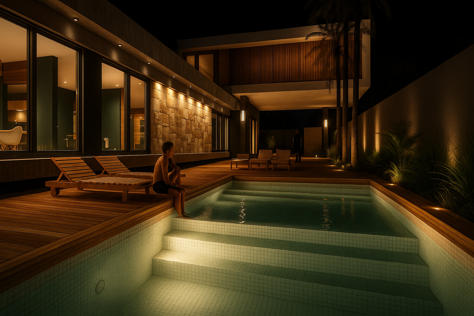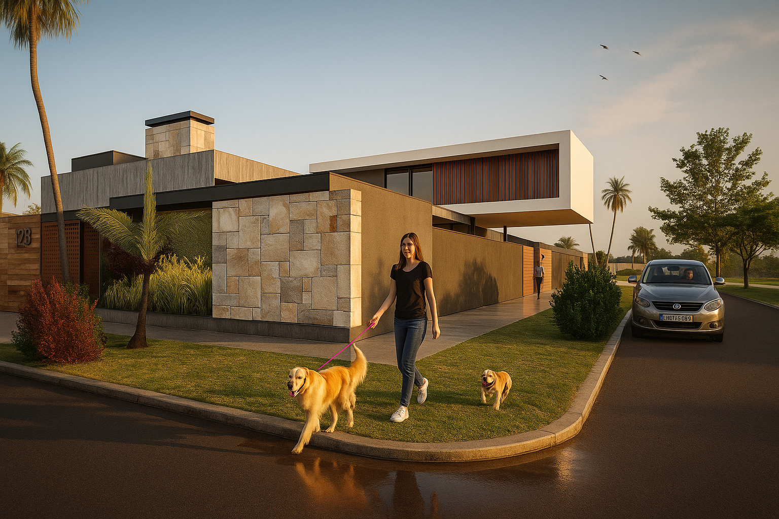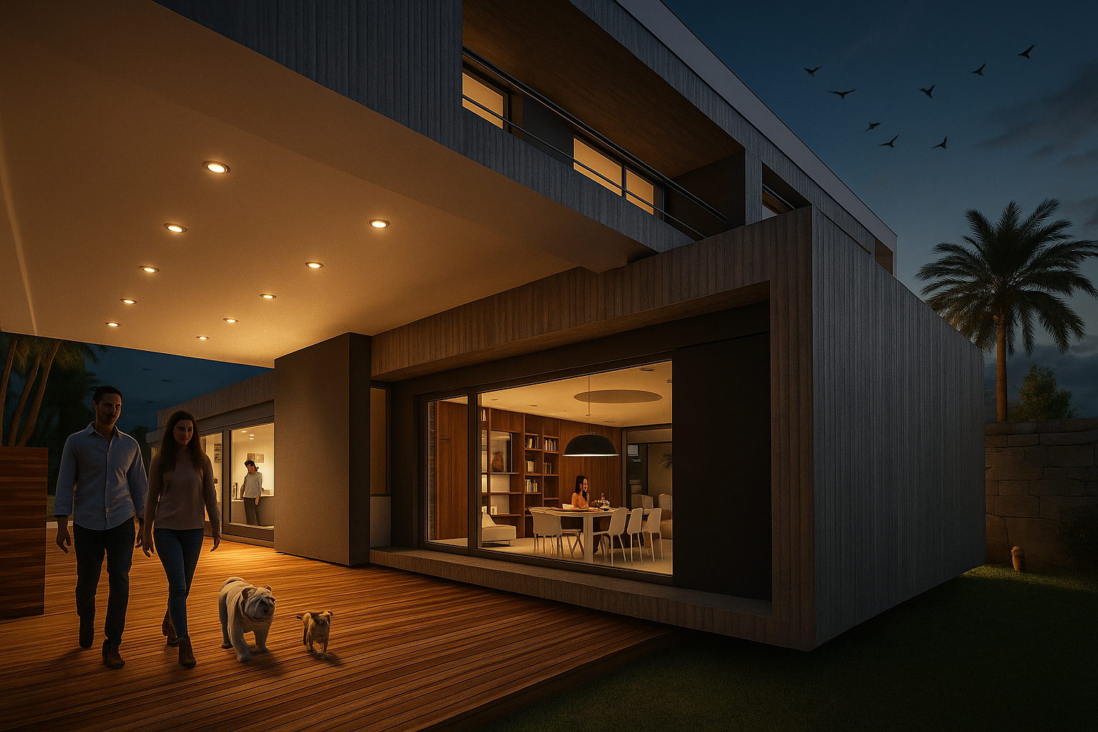Vivienda que enfatiza la conexión entre los distintos ambientes componentes y de estos con el exterior, pero que a la vez se protege de las agresiones por medio de cerramientos dinámicos que actúan de barrera evitando la necesidad de elementos de cierre tradicionales. Al ingresar nos encontramos con el espacio social compuesto por el estar comedor integrados con apoyo de closet y toilette de cortesía. Estos espacios se perciben como un conjunto dado que los aglomera una gran caja de hormigón que los contiene y la cual sirve de nexo entre los diferentes espacios. Y que por medio de aleros perimetrales cobija los materiales de las inclemencias del tiempo. El sum también posee esta característica de interrelación con el exterior abriéndose sobre el deck para poder disfrutar de lo hecho en la parrilla sentados al aire libre un buen día de sol, o compartir un asado con la gente que se encuentra en la piscina utilizando la misma parrilla o área de fuego. La casa cuenta con un acceso independiente, que bien puede funcionar como ingreso de servicio para el mantenimiento de la piscina o la jardinería sin atravesar la casa, o para sacar al perro y las bicicletas, pero también puede funcionar de ingreso independiente del sum ante un eventual evento para que no disturbe el descanso en la suite o dormitorios, contando con su videoportero individual. Da como resultado una caja de hormigón que flota sobre el terreno dejando que el espacio fluya de un ambiente a otro sin interrupciones pero que a la noche o durante una larga ausencia pueden cerrarse mediante sistemas motorizados de cortinas metálicas que clausuran las posibilidades de eventual intrusión. Los muros bajos que bordean la composición serán materializados con ajardinamiento vertical proporcionando, al ave de una propuesta agradable, una protección virtual a la voluntad de âtreparâ estos muros.