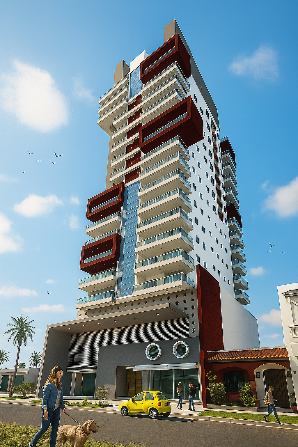 Formosa crece y con un nuevo código urbanístico que plantea nuevas posibilidades de visuales planteando la construcción de basamento y torre. Obviamente este caso solo puede darse en terrenos de dimensiones generosas Esto deriva en opciones de visuales prácticamente en todas direcciones, donde el planteo brinda departamentos con vistas a dos caras como mínimo de la torre. Priorizando las sensaciones, haciendo un trueque del patio tan arraigado en los formoseños por las imponentes vistas dentro de las cuales está la de la costanera en los pisos más altos Además, Vivir en altura en Formosa, plantea una experiencia nueva. para imponer esta nueva sensación son necesarias las opciones diversas que permitan la apropiación del usuario El proyecto plantea locales comerciales en planta baja, estacionamientos en los niveles siguientes, y en los niveles restantes, residencias en altura, coronando todo con un sum con piscina en la terraza deck